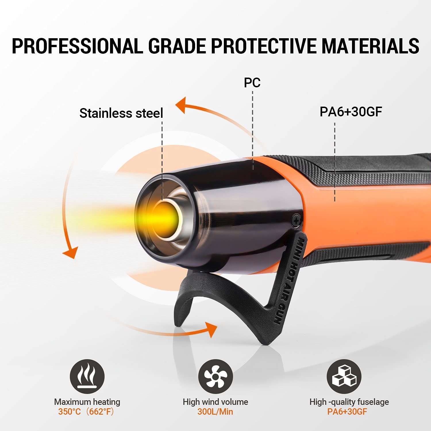 High-power rapid heating, the maximum power is 350W, and the maximum temperature reaches about 350°C. The use of nickel-chromium heating wire structure and mica bracket can accelerate the heat dissipation speed and prolong the service life. Simple and lightweight design, stainless steel tuyere, external PC&PA6 + 30GF is more durable, plastic shell uses non-slip soft rubber; can be used to burn powder, remove old paint, heat to shrink film, defrost and remove dirt, etc., very suitable for DIY. 2M long battery and extra long power cable make the working area larger